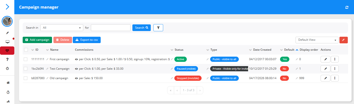 Here is a screenshot depicting campaigns with all the three statuses: