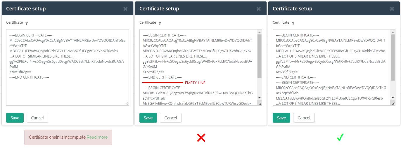 - Paste the certificates into the field, with the end-user certificate first, followed by intermediate and root certificates, each on a new line and without extra line breaks.
