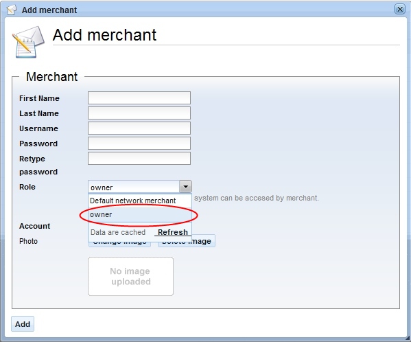 Navigate to Merchant Panel > Start > Tools > Merchants and click the Add Merchant button. For the merchant role, select the owner role you just created, and for the account, use the default owner account.