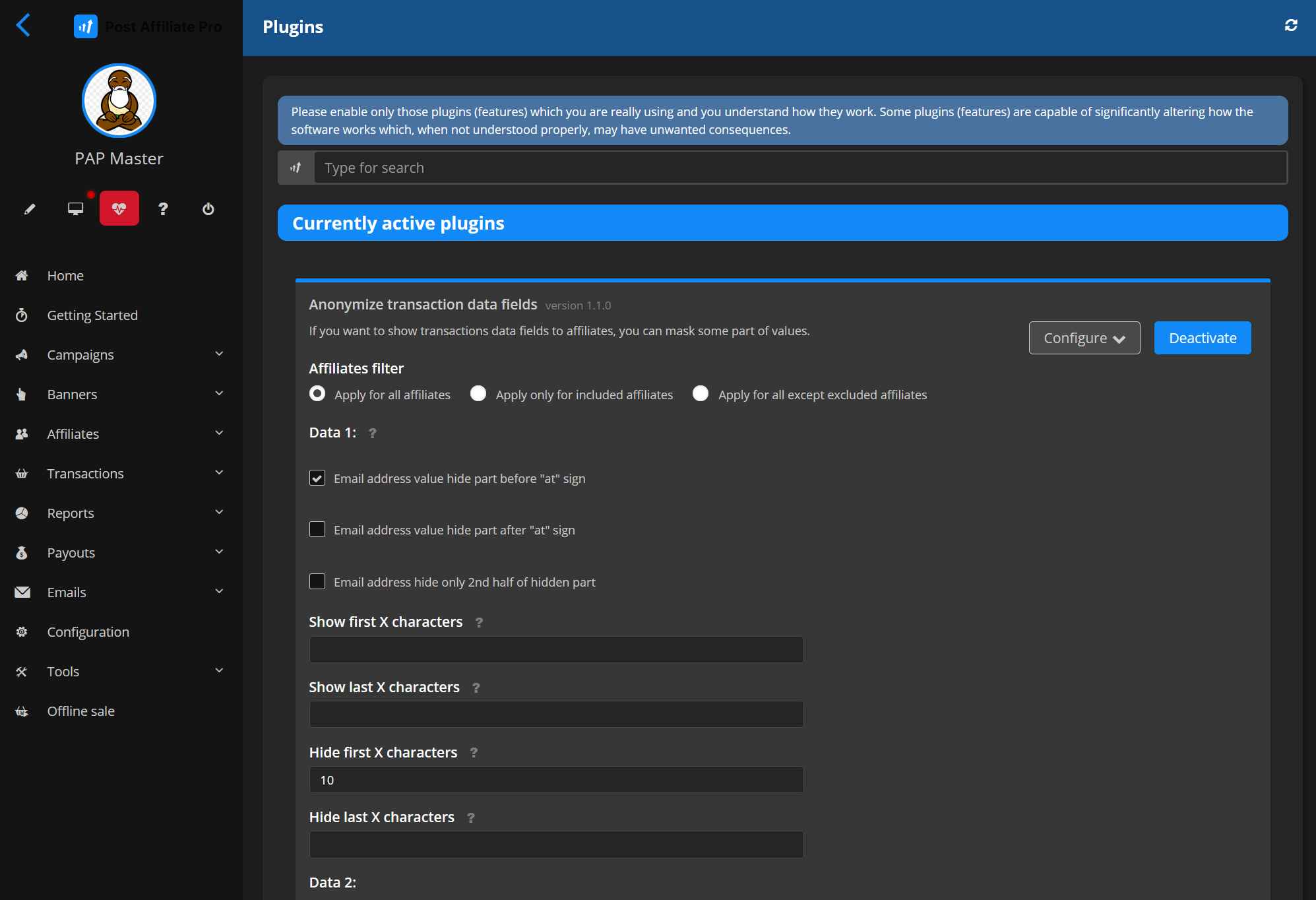 The Anonymize transaction data fields plugin helps you protect sensitive information by anonymizing data stored in the five custom transaction fields (Data 1–5). This feature is especially useful if your affiliate program handles personal or sensitive data and you want to comply with privacy regulations or internal data protection policies.