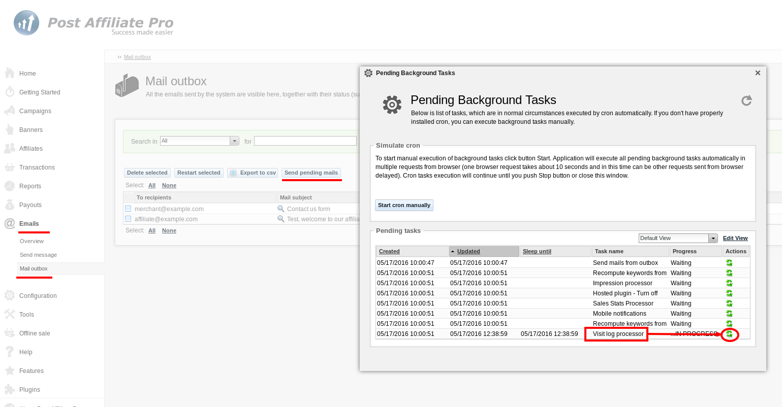 If you would like to manually trigger the processing, navigate to Emails > Mail outbox and click the "Send pending mails" button. This will open a window with "Pending Background Tasks", where you need to find the "Visit log processor" task and click the green "refresh" icon next to it (you may click a couple of times to ensure the task has been processed):