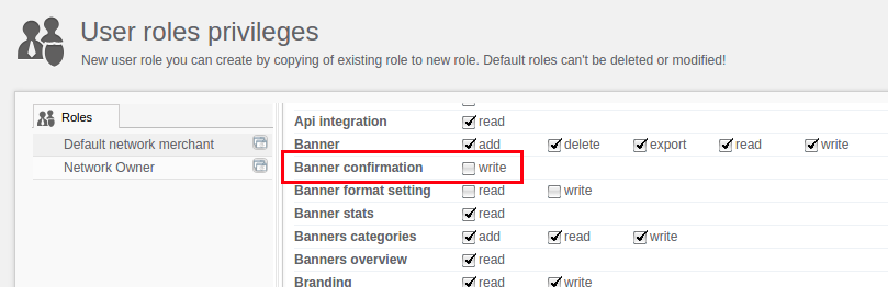 The network owner can grant merchants permission to approve their own banners. When this permission is enabled, all future banners created by the merchant will be automatically approved.