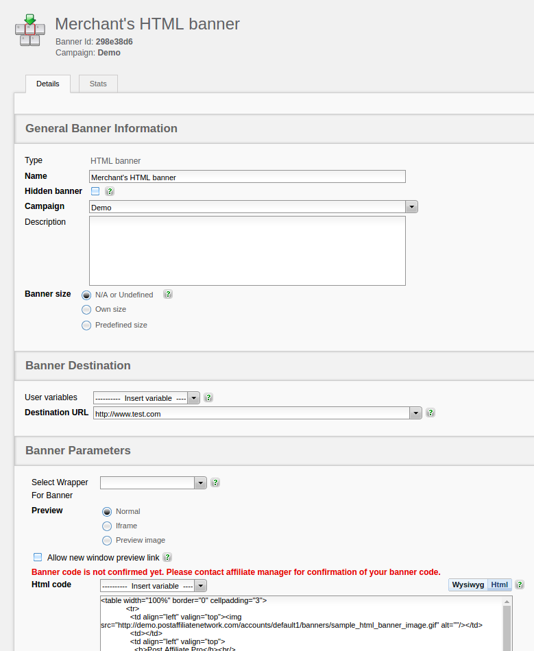 The Banner Confirmation feature prevents merchants from using banners until the network owner approves the HTML code. Merchants will see the following message: