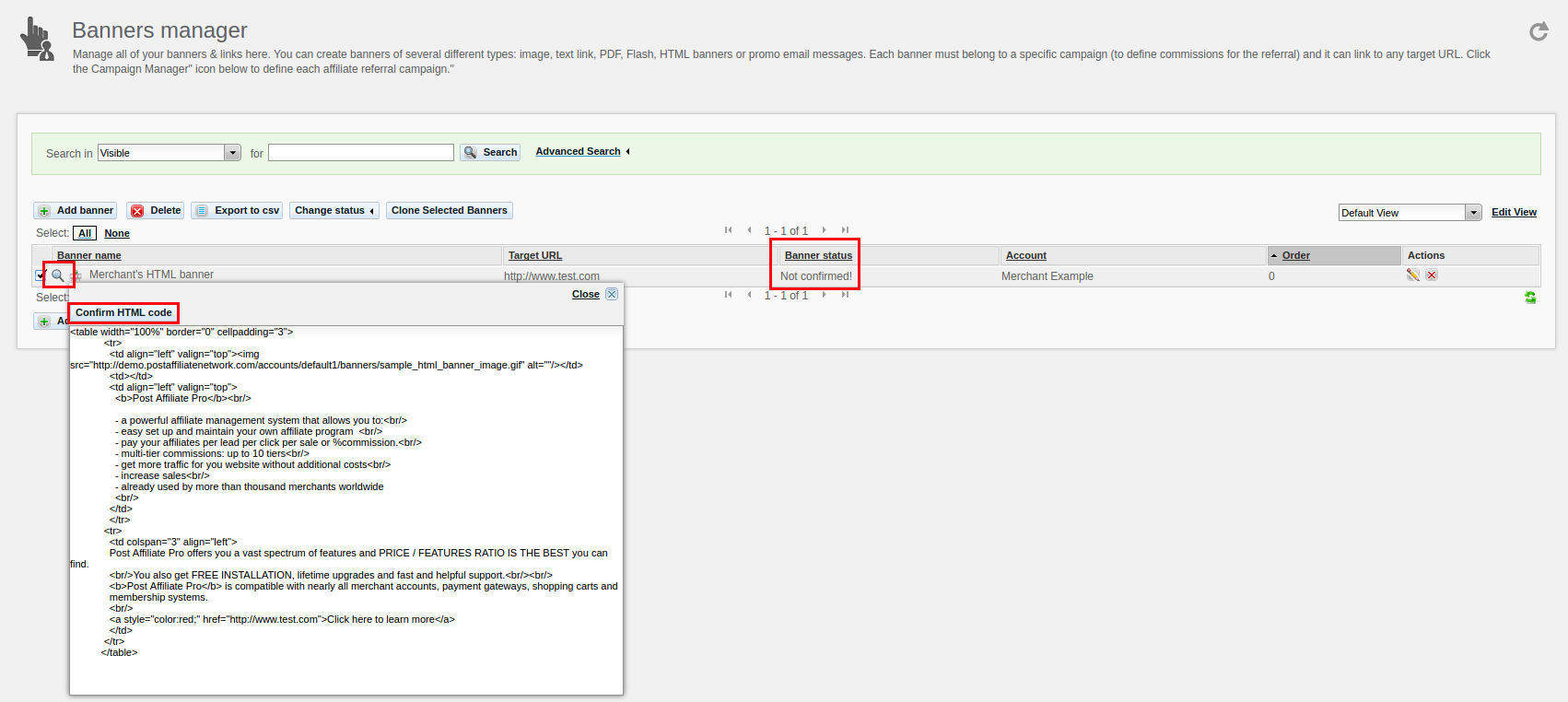 In the Banner Manager, under the Banner Status column, a Not confirmed! message will appear. The owner can confirm the banner code directly from the Banners Manager screen by clicking the magnifier icon next to the banner name, as shown below: