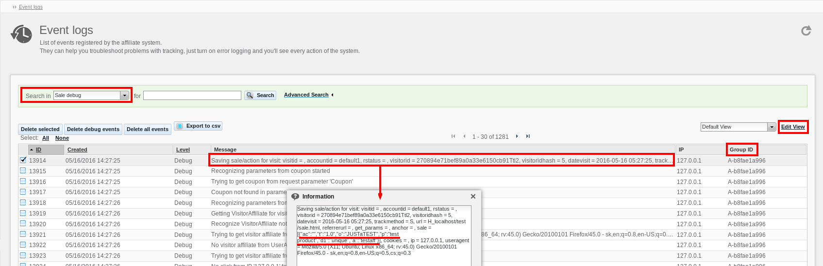 Then, navigate to Tools > Event logs, and in the upper left corner, under Search in, select Sale debug. The screenshot below highlights the most important elements: