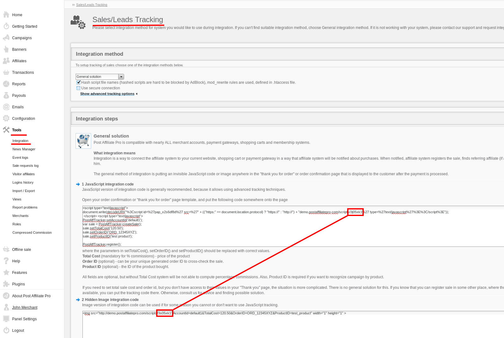 Go to your merchant panel at Tools > Sales/Leads tracking, check the box for "Hash script file names" (if it is not already checked), and note the names of the scripts. We are interested in the strings of letters and numbers immediately following /scripts/, as shown in the screenshot: