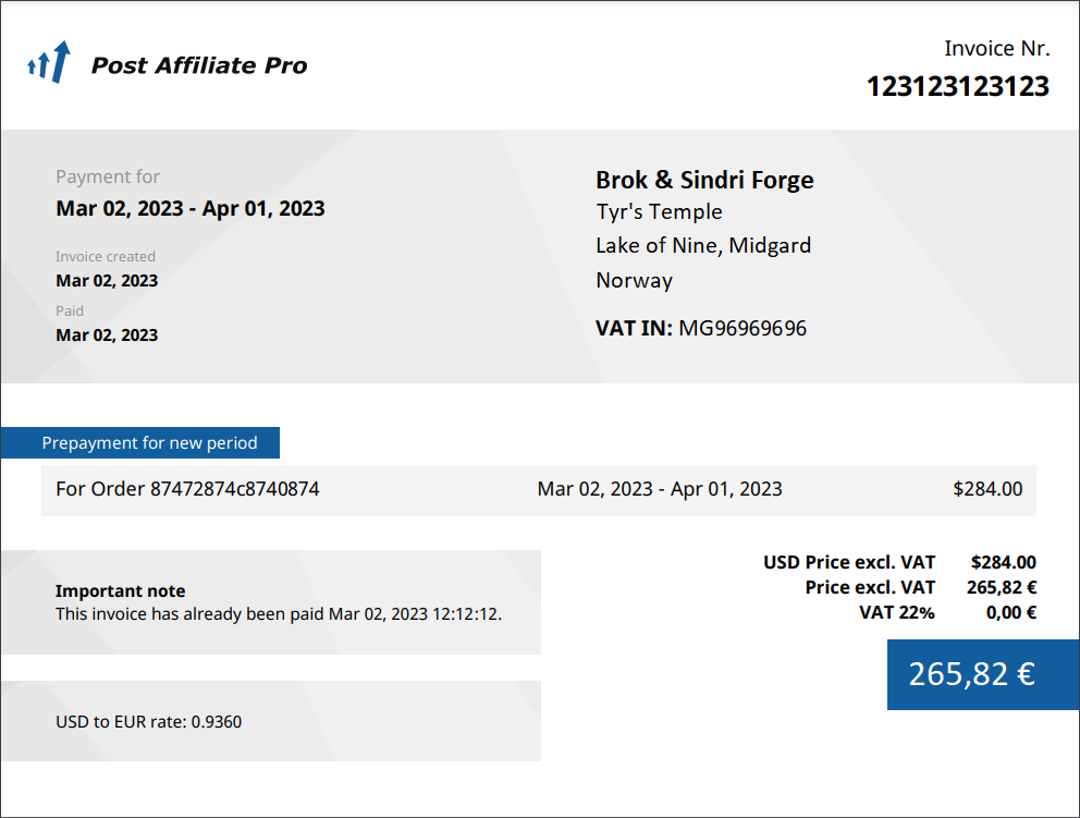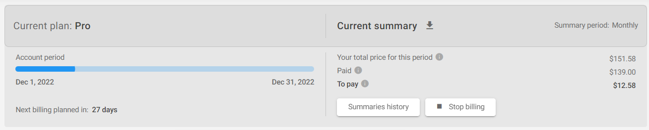 Although the summary is always generated in US dollars ($), for EU customers the price on the invoice is recalculated and charged in euros (€) based on the current exchange rate on the billing date.
