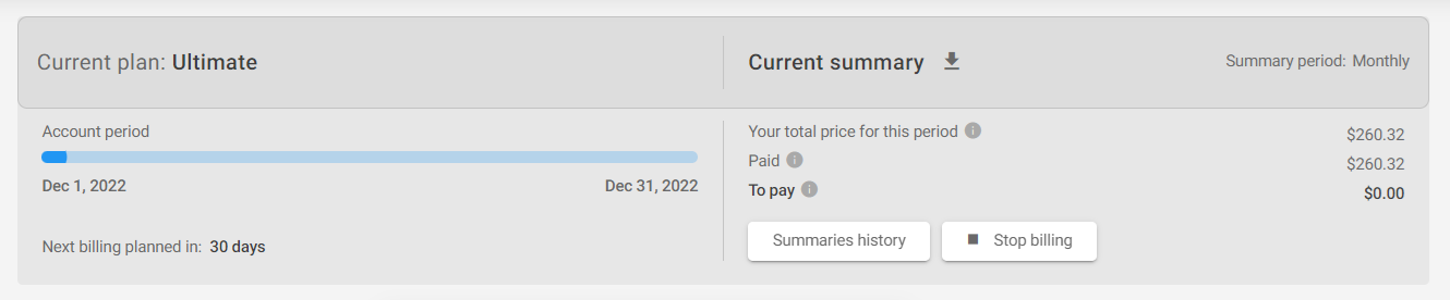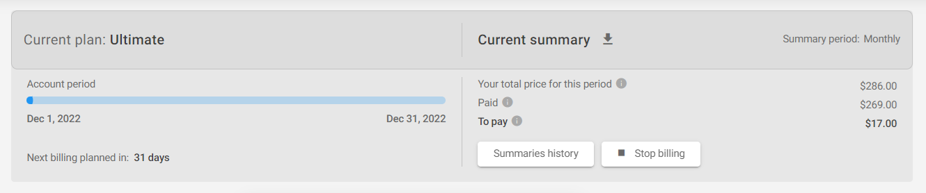 - Today is the 1st day of the month (1.1.) and you've recently upgraded your Trial account to the Ultimate plan. Your current pre-paid monthly usage is $269. Downgrading tomorrow to the Pro plan will provide you with a $125.80 credit that will be deducted from your next payment on your next billing day (1.2.).