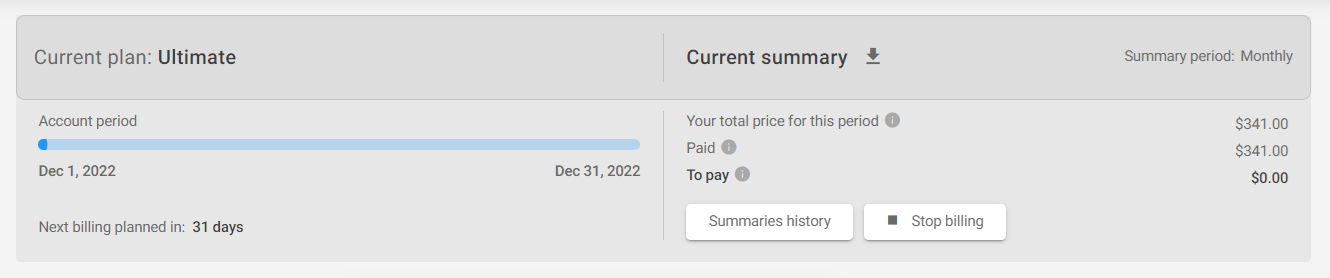 - Today is the 1st day of the month (1.1.) and you've recently upgraded your Trial account to the Ultimate plan with all additional addons. Your current pre-paid monthly usage is $341. Removing all extra paid addons will provide you with a $72 credit that will be deducted from your next payment on your next billing day (1.2.).