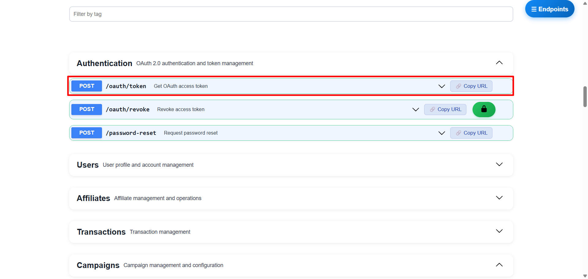 In the Authentication section expand POST /oauth/token.