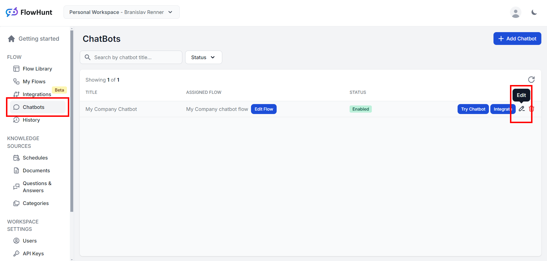 To set this up, first navigate in your FlowHunt account to the "Chatbots" section and edit your chatbot.