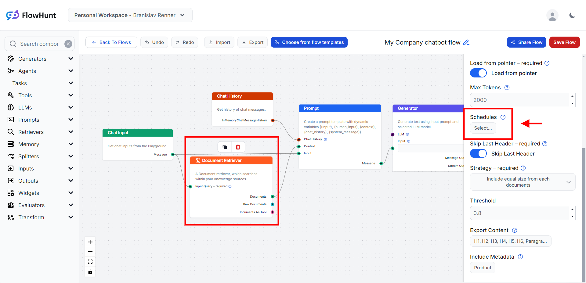 Within your flow, click on the "Document Retriever" component to edit it and select the schedule you recently created in the component's settings Schedules section. Don't forget to hit "Save Flow" in the top right corner.