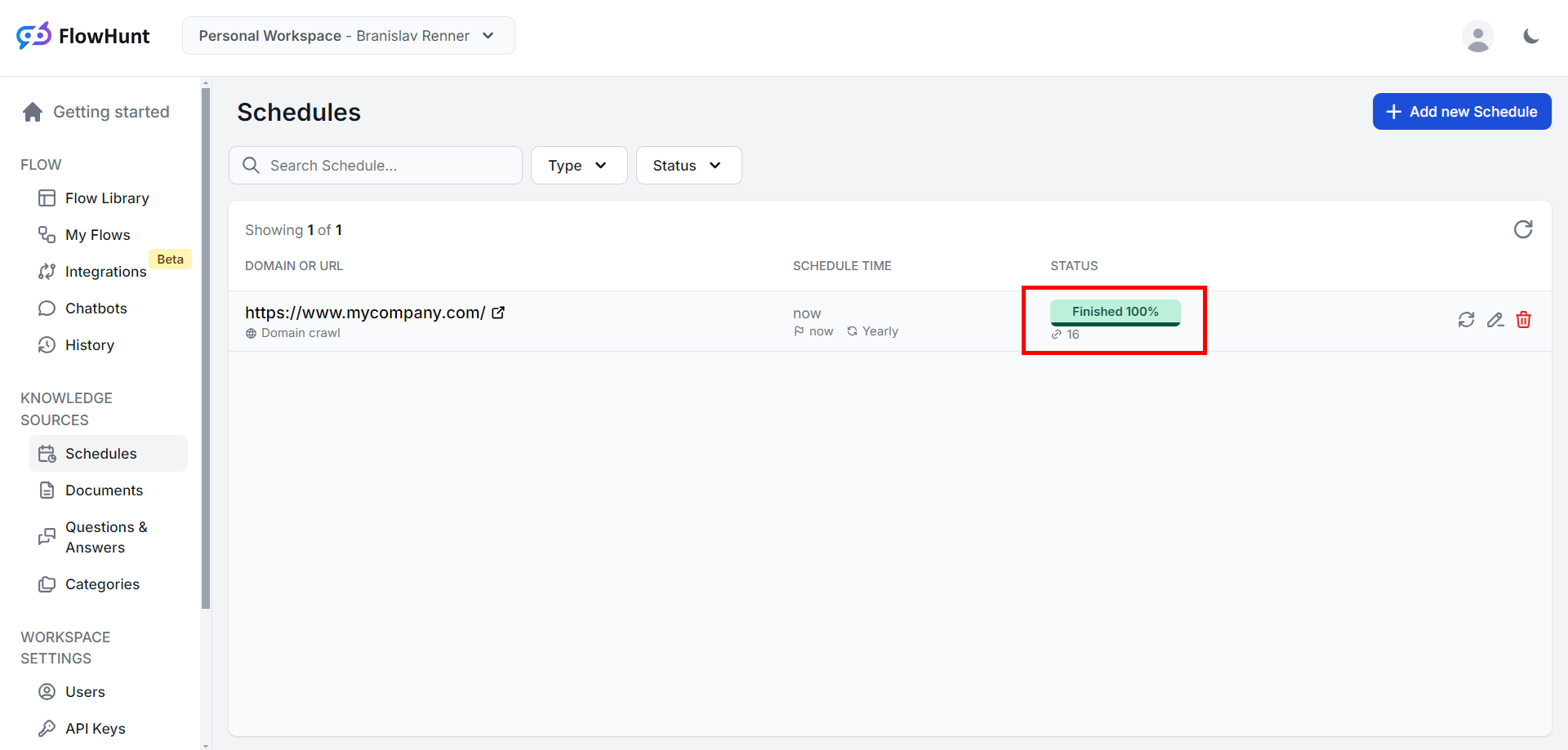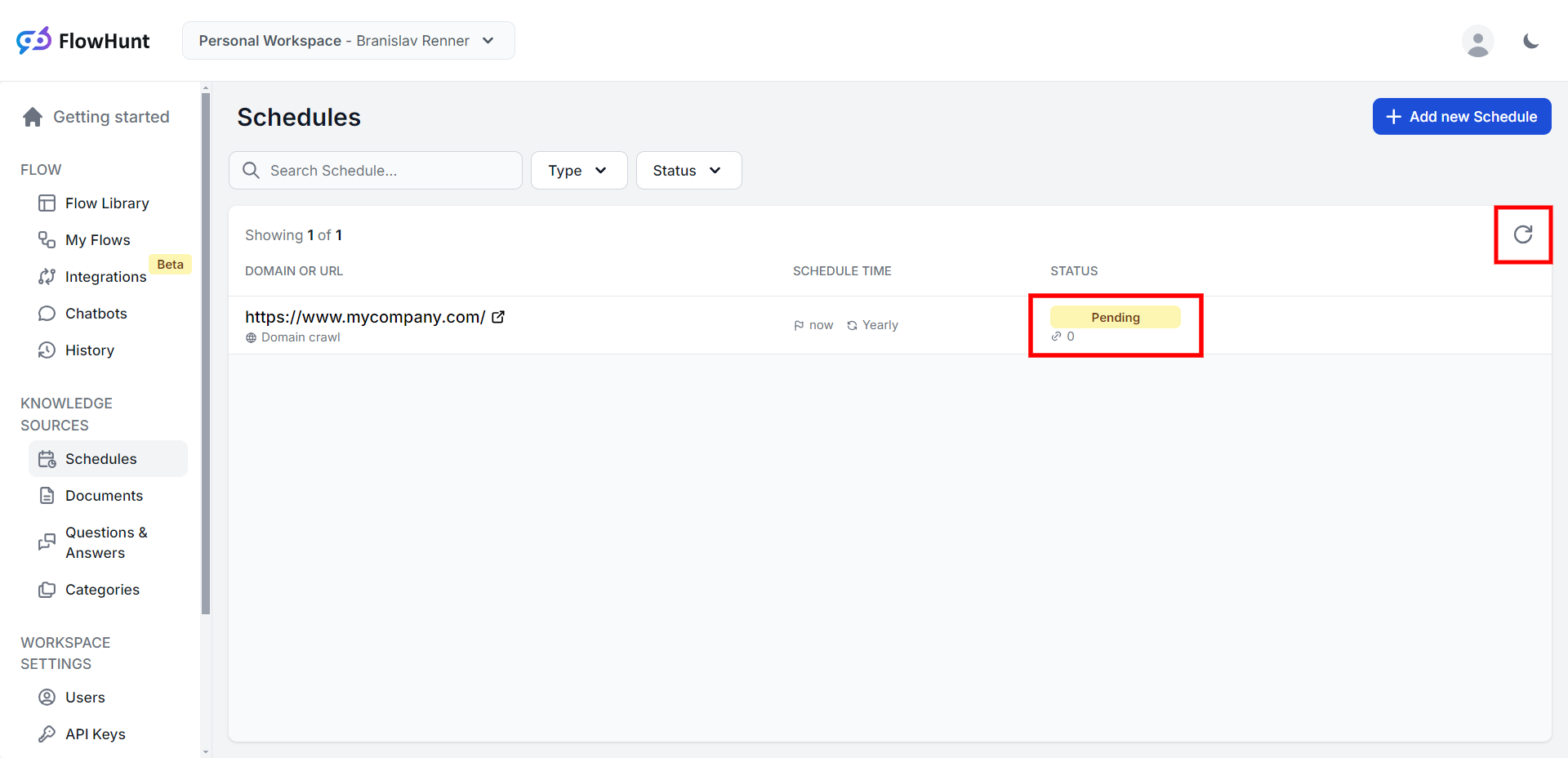 After saving the schedule, FlowHunt begins indexing your website/page. Click the refresh button in the top right corner of the schedule list to refresh & see the task status.