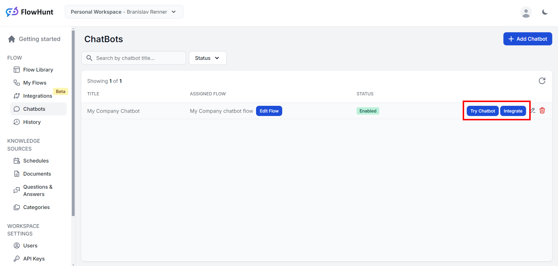 After creating your chatbot, you can test it straight away by clicking the "Try Chatbot" button at the end of its row in the Chatbots section.