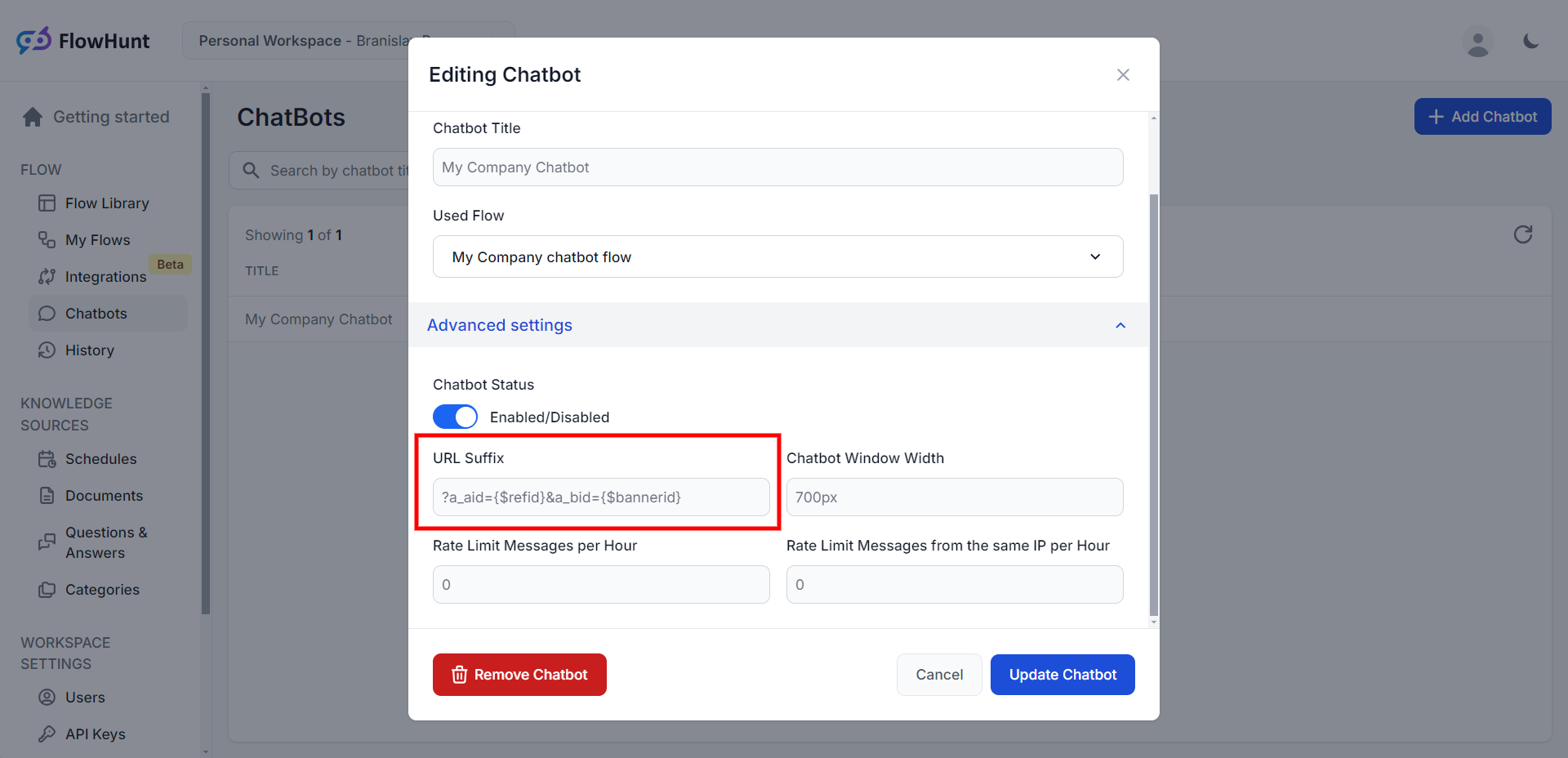 In the chatbot settings, click to show the Advanced settings and insert ?a_aid={$refid}&a_bid={$bannerid} into the "URL Suffix" field. Save the change by clicking "Update Chatbot".