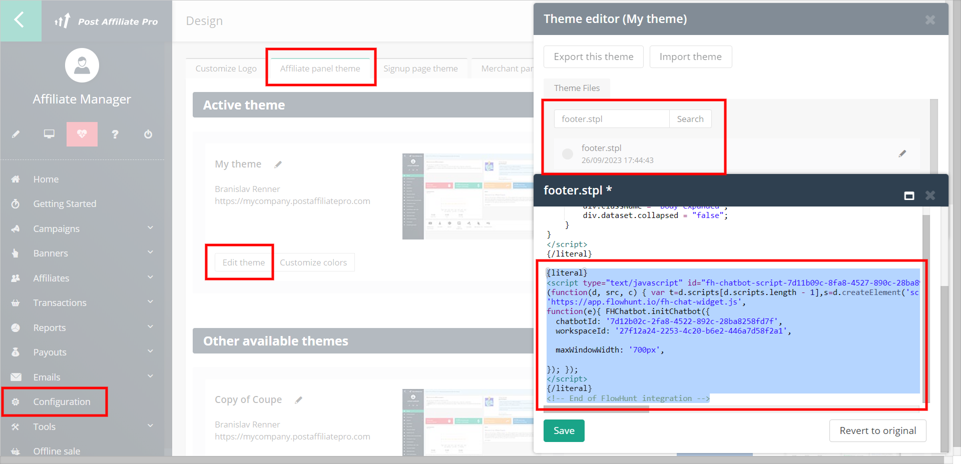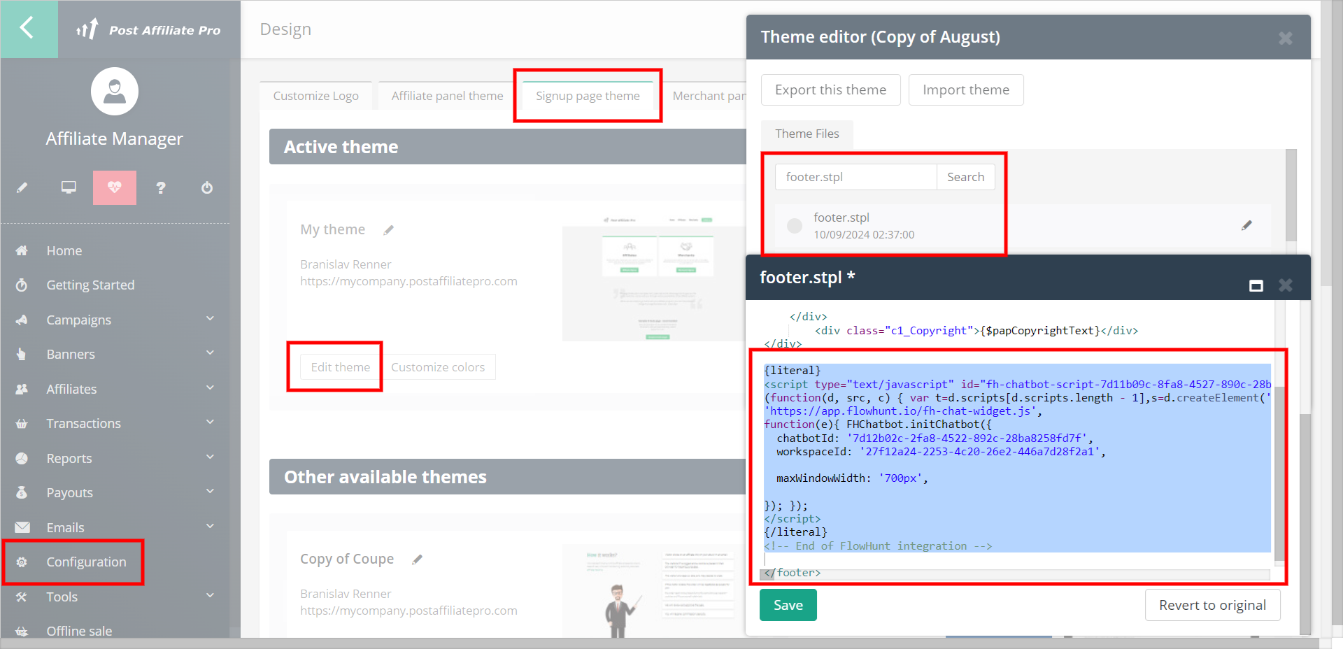 If you want to add the chatbot to your Post Affiliate Pro portal, navigate in your merchant account to Configuration > Design > Signup page theme, edit your active theme, open the "footer.stpl" file, and add the script before the </footer> HTML tag. Remember to enclose the script into the {literal} {/literal} tags, as all scripts need to be.