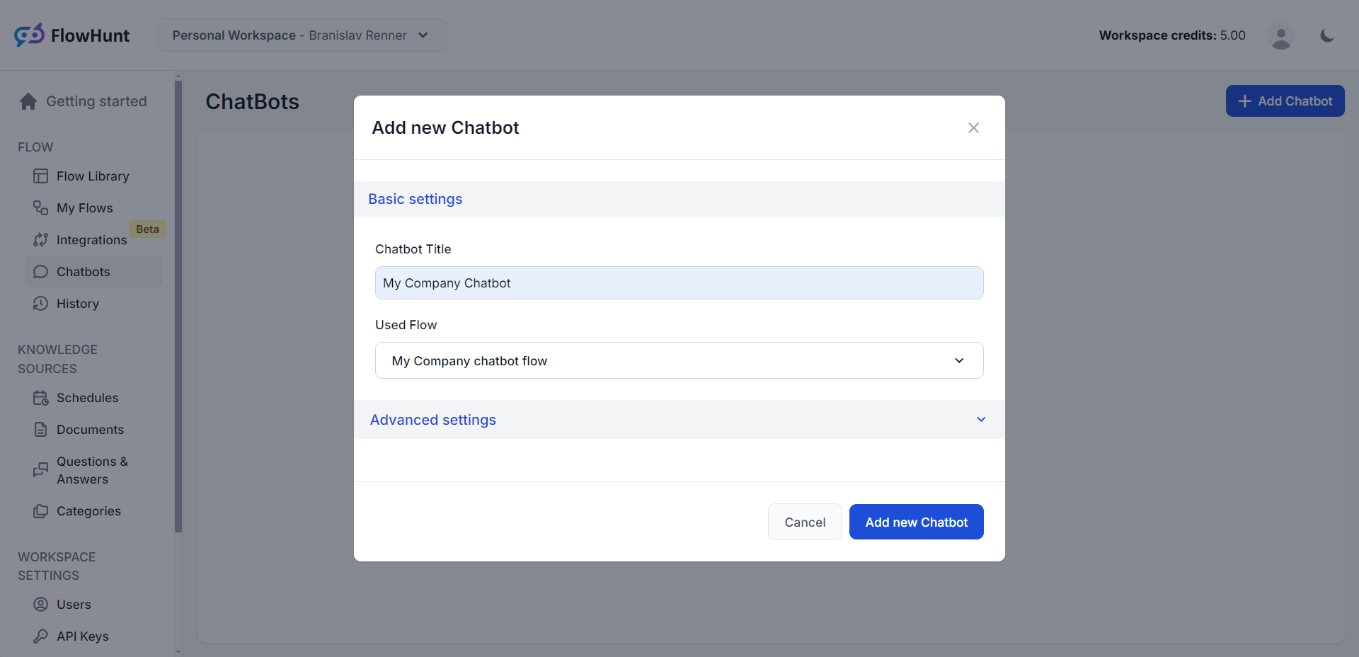 In the pop-up window, name your chatbot and select the flow you've created for it. Finish the chatbot configuration by clicking "Add new Chatbot".