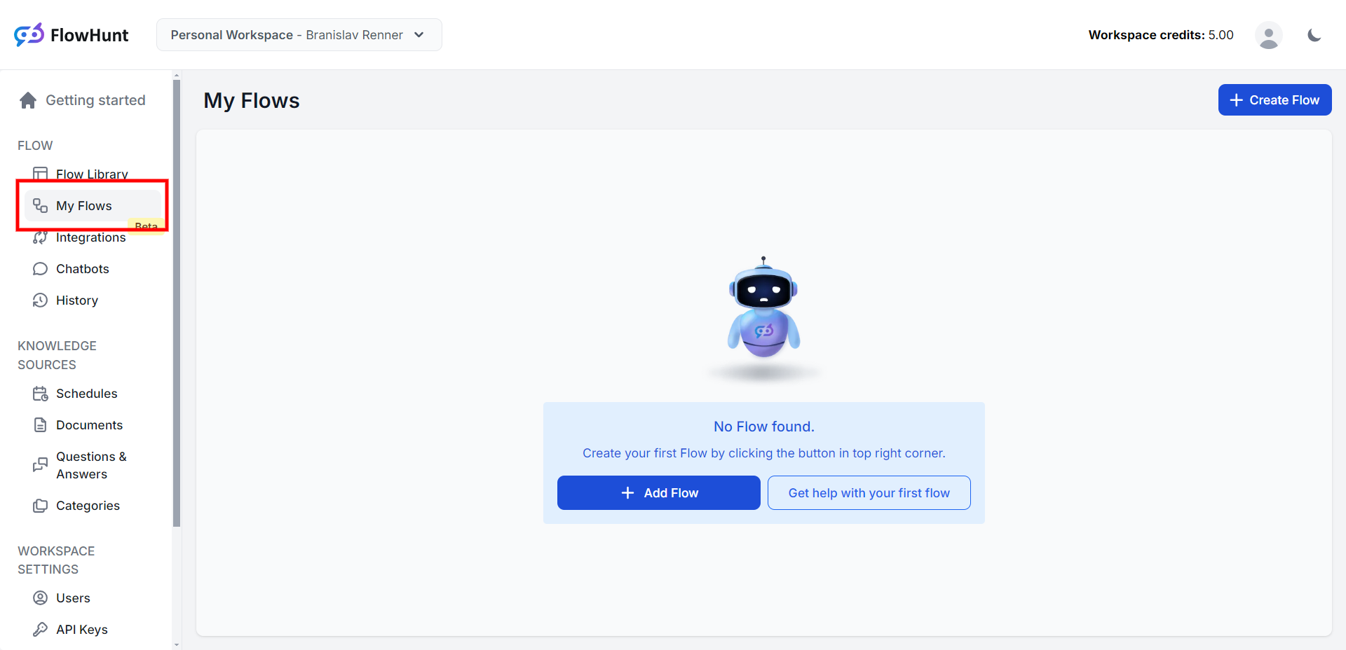 Once logging in, navigate to the "My Flows" section in the menu and click on the "+ Add Flow" button. Name your new flow, optionally write a description for it, and click "Create new Flow".
