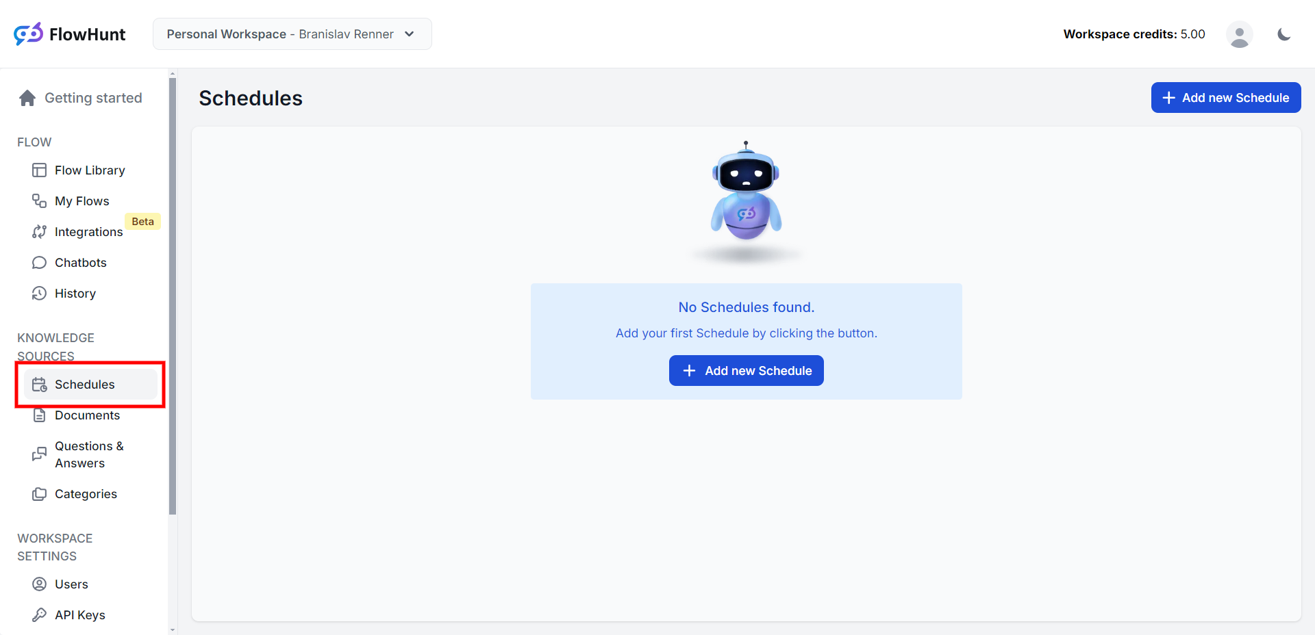 After creating your flow, it's advisable to add knowledge sources. To do this, click the "← Back To Flows" button on the top management panel, then navigate to the "Schedules" section in the menu. Click "+ Add new Schedule" to add your website to the available sources for the flow.