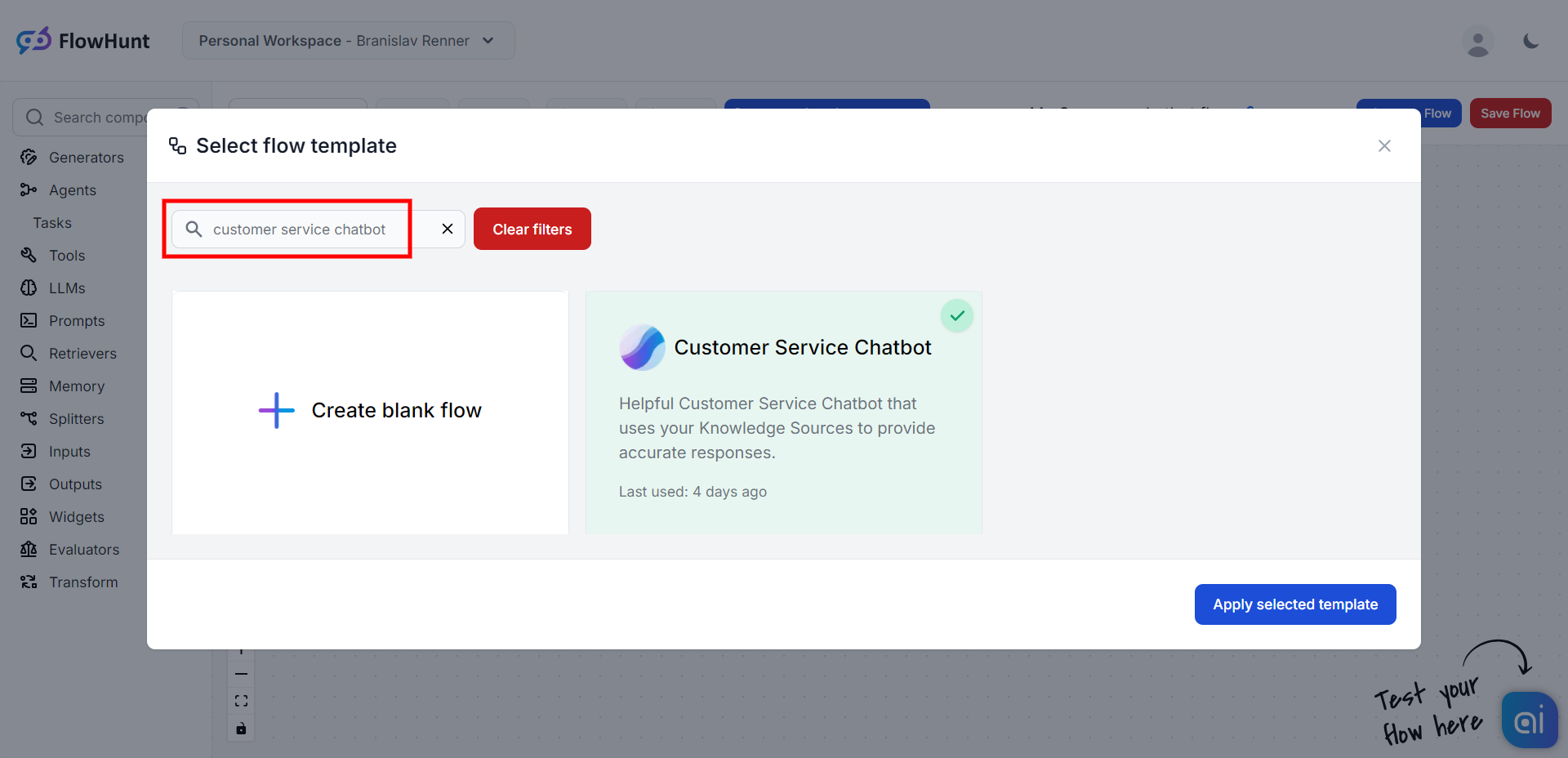 After creating your flow, you can choose to use one of our predefined template flows or create a new one. For basic integration purposes, we recommend selecting the "Customer Service Chatbot" template and clicking "Apply selected template".