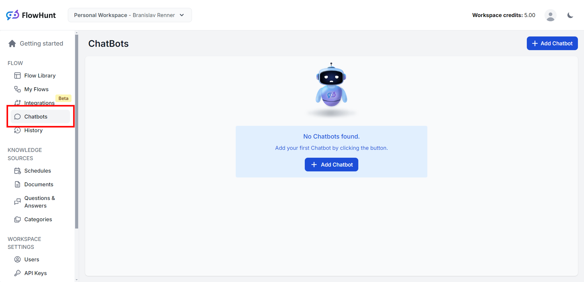 Click the "← Back To Flows" button to get back to the main screen and navigate to the "Chatbots" section. Click on the "+ Add Chatbot" button to create a new chatbot.