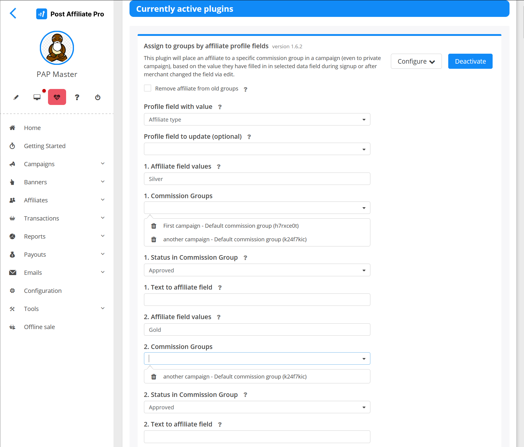 The Assign to Groups by Affiliate Profile Fields plugin for Post Affiliate Pro (PAP) allows you to automatically place affiliates into specific commission groups within any campaign (including private campaigns) based on the values they enter into selected profile fields (even fields of type Hidden). This can occur during affiliate signup or when a merchant edits the affiliate's profile.