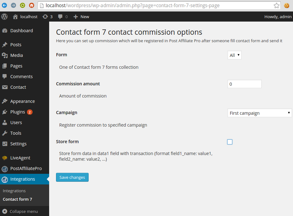If you wish to track the submission of contact forms generated by 'Contact form 7' WordPress module then navigate in the dashboard (wp-admin) to PostAffiliatePro > Integrations menu, turn on the Commision for every new contact option and click Save Changes.